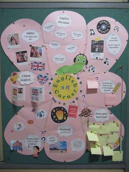 2学期から九条中ALTとしてお越しいただいているケイティ—先生が、今日の放課後、遅くまでかけて、とっても素敵な「English Corner」を作っていただきました。Thank you very much !