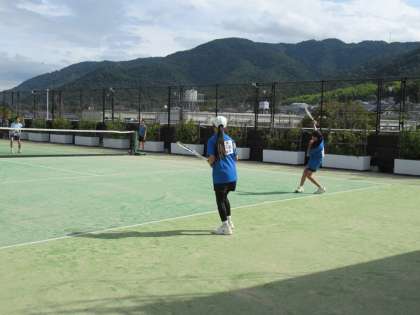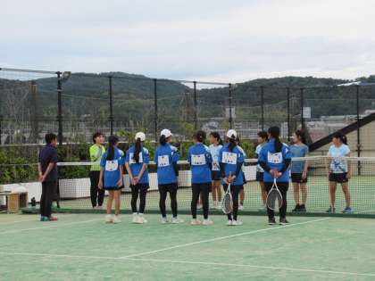 昨日(9/20)、ソフトテニス部は、秋季新人大会「団体予選」に臨みました。試合会場はD醐中学で、こちらのテニスコートは体育施設の3階屋上にあり、とても見晴らしのよい場所です。