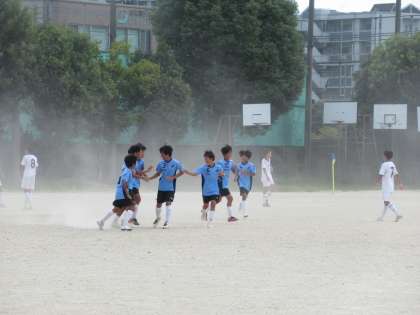 前線でボールをキープした九条合同2番の選手が、横へのドリブルでうまくシュートコースを作り、キーパーの逆をついたナイスシュートを決めます。ゴール!巧みな個人技を見せてくれました。
