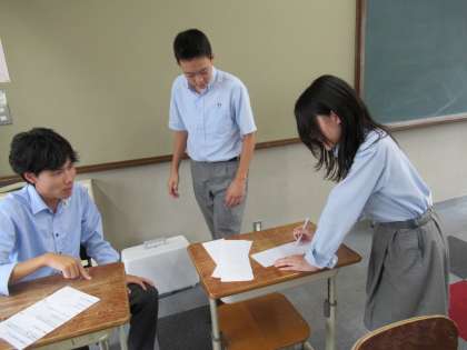 今日は、立候補者のタスキづくりと垂れ幕づくりです。選挙管理委員さんが協力して、模造紙を切り分け、形にしていってくれます。