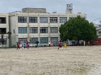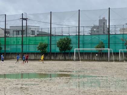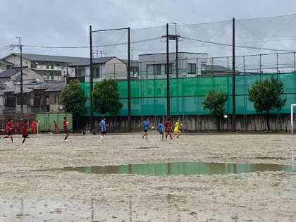 前半、九条合同は、やや押され気味ながら攻守の切り替えの良さを生かし、スペースに走り込み、一気にゴールまで迫る作戦です。惜しい!
