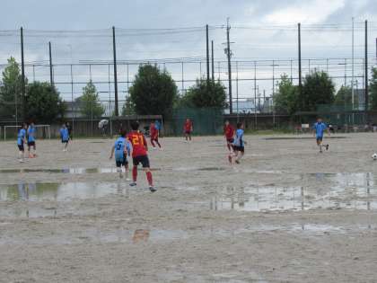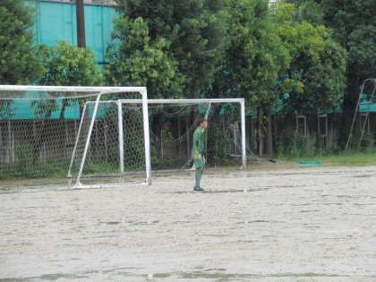 雨天でのサッカーは、特に、ディフェンス面での緊張が高まります。水たまりで急にボールが止まったり、逆にイレギュラーにバウンドしたり、ゴールキーパーも前へ出るタイミングに神経をとがらせていたようです。
