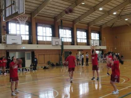 多くの団体競技でブロックリーグ形式が採用される中、バスケットボールは初めからトーナメント形式の大会となります。負けた時点で大会終了の緊張感はありますが、そのようなことはもろともしない女子チームの登場です。おっ、声がすごい!気合十分です。