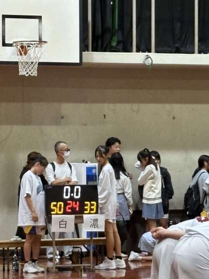 5人でのチームDFからの速攻で相手を止め、得点差を広げます。ラスト30秒で時計が止まり、いつもチームを大きすぎるほどの懸命な応援で支えてくれている1年生のSさん、Nさん、Tさんもコートに入ります。そして試合終了。最終スコア50−33でベスト16進出です。