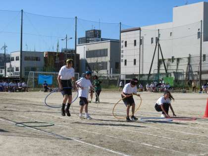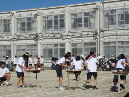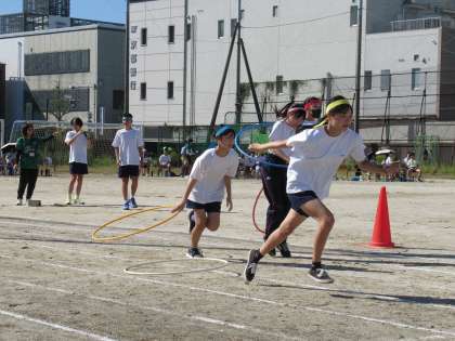 プログラム3番は「レクリエーションレース」です。トラック内に設置された4つのコーナーでお題をこなしながらゴールを目指す、個人種目です。全員が挑みました。