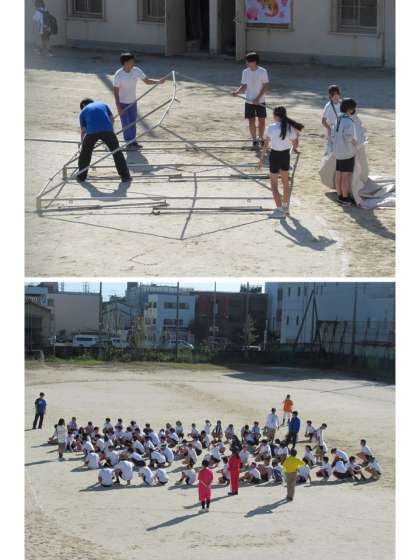 こちら体育祭後のグラウンドの様子です。そうです、委員会や部活動から参加してくれた皆さんが、残って後片づけを行ってくれているところです。
