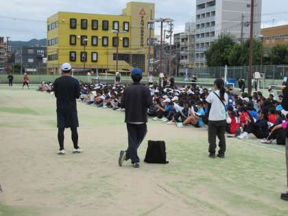 また、この日も、個人戦とはいえチーム全員で戦います。応援コール「行け行け九条!」に「倍倍九条!」、ここぞの「勝ったら焼肉!」も西院コートに響き渡るほどでした。素晴らしい!