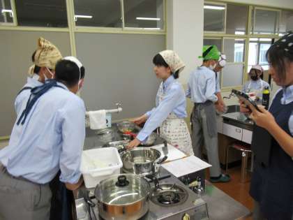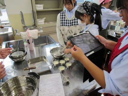 調理を進めながら、使い終えた器具の後始末やGIGA端末での調理の記録も並行して行います。皆さん協力して手際よく進めていましたね。