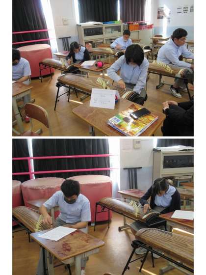 本日2限に、音楽室からきれいな和楽器の音色が聞こえてきました。思わず覗かせていただくと、4・5組の皆さんが、箏(こと)の演奏練習をしているところでした。