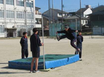 まず、1年体育の授業では、「走高跳」に取り組んでいます。本日の授業では「力強い踏み切り」をテーマに、グループワークで課題を設定します。