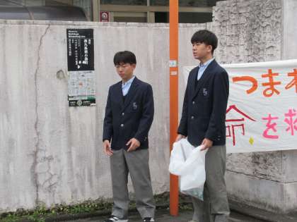 今朝の登校時、11月の回収運動を実施しました。今朝も、朝早くから登校し、準備をしてくれた生徒会本部役員の皆さんにとっては、最後の回収運動となります。これまでのことを思い起こしているかのようにも見えます。ご苦労様でした!