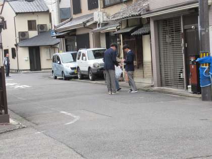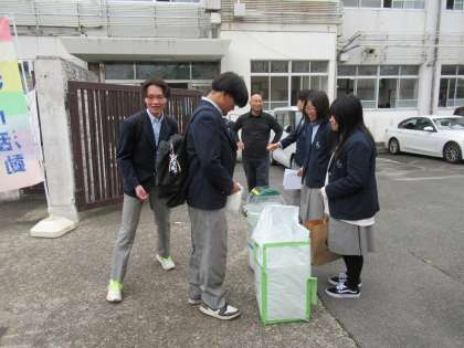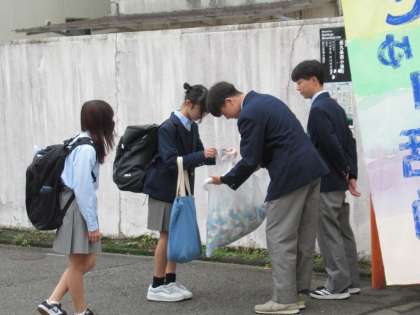 今朝も、元気に呼びかける声が響きます。それに合わせるかのように提供してくれる生徒の皆さんです。あっ、いつものご近所の方も出てきていただきました。ありがとうございます!