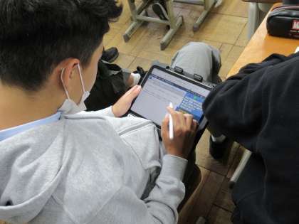 なんとここでもGIGA端末が大活躍です。タブレットの学習ソフトで、あるグループはノート機能を使い学習内容を共有し、また、ある人はドリル機能を使い個人で解答しています。
