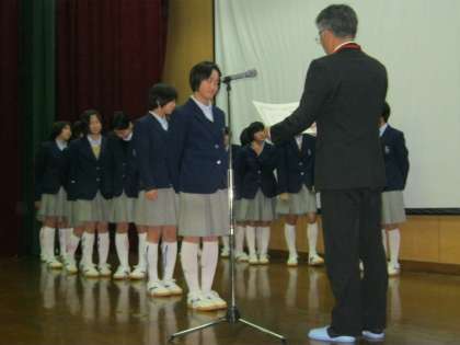 表彰(美術交歓作品、書き初め展、女子ソフトテニス部、女子バレーボール部)
