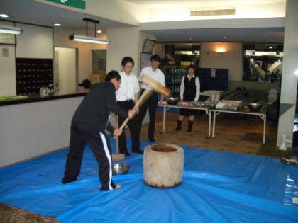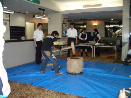 (8)午後からは、インストラクターさんのデモンストレーションを見学した後も、講習が続きました。その後、ホテルのロビーで餅つきをしました。