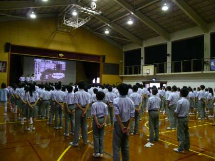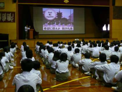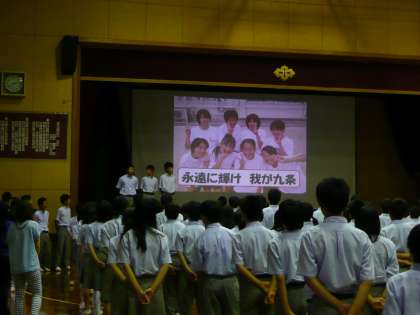 九条中の歴史と校歌の歌詞の意味を確認した後は,大きな声で校歌を歌いました。