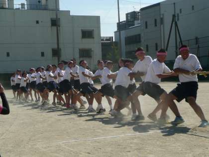 体育祭もいよいよ終盤。クラス対抗の綱引きです。今こそクラスのみんなの力を合わせて…