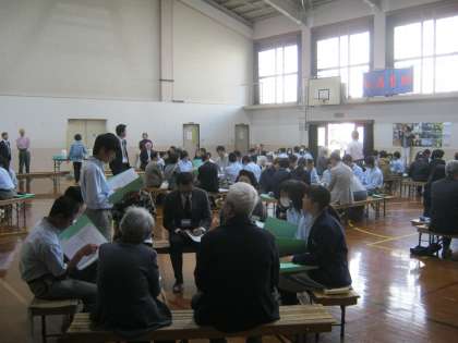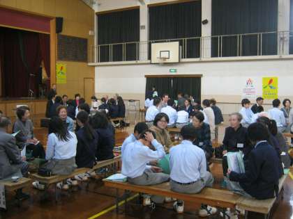 11月4日(水)の午後、体育館にて第14回ふれあいトークが行われました。今年は1年生59名と来校いただいた大人の方々44名が、グループに分かれてトークをしました。九条中学校区の地域住民の方々と九条中学生が、九条地域の過去・現在・未来を共に考え、ふれあいの場を広げることを目的に取り組んでいます。大人も子どもも時には笑顔も交えながら、真剣に話し合っていました。「地域の子どもは地域で育てる」その思いが伝わってくるようでした。