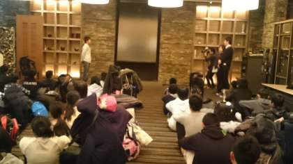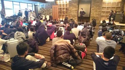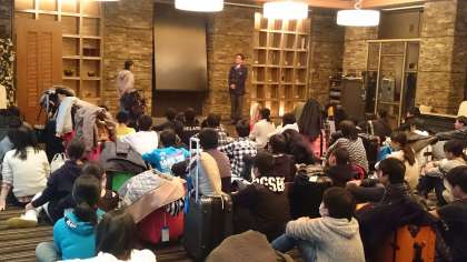 退館式の様子です。お世話になった宿舎の方や添乗員の方へお礼の言葉、また宿舎や添乗員の方々より言葉をいただきます。いよいよホテルを出てバスで京都へ出発です。