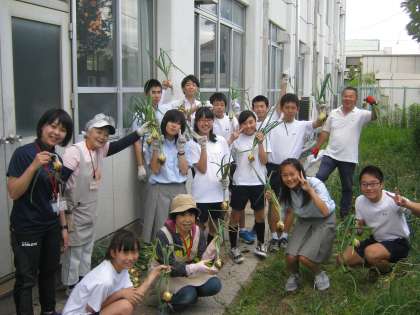 北校舎の東側の畑には大きく実ったタマネギが土から顔を出していました。昨年、園芸部が植えたタマネギが収穫時期を迎え、本日、その作業を行いました。日頃お世話になっている地域のボランティアの方々や教育実習生も一緒になって収穫しました。みんなとても満足した様子です。次は何を植えるのかな?