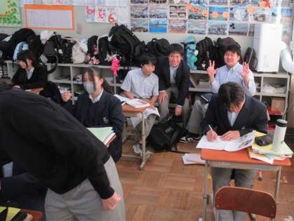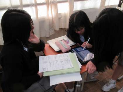 こちらは、3年1組です。よく見ると、GIGA端末が一つの学習用具として浸透していることがわかります。こちらでは個人学習に、あちらでは友達への説明に、身近なツールとして活用されています。