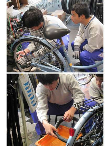 本日、自転車屋さん「サイクルベースあさひ九条店」でチャレンジ体験をさせていただいているH・YさんとK・Sさんの所へ、学校の自転車のパンク修理をお願いに行ったところ、見事、2人の連携作業で直してくれたのです。素晴らしい!