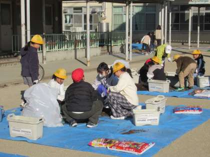 そして今日は、九条弘道小学校でもプランター作りが行われました。こちらも、チャレンジ体験中の九条中2年生も一緒に取り組みます。