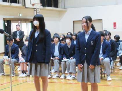 授業に先立ち、税の作文コンクールの表彰が行われ、たくさんの応募の中から優秀作に輝いた3年生2名が、市税事務所長様より直接表彰を受けました。すごい!おめでとうございます!!
