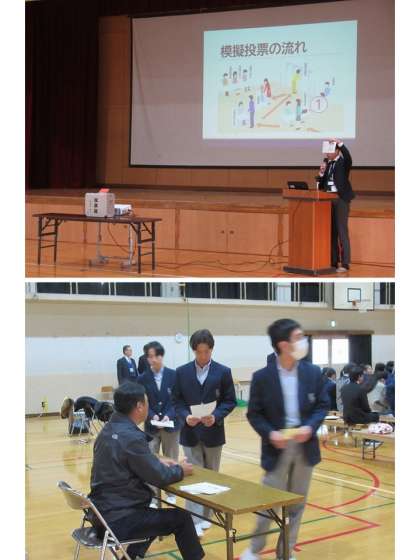 選挙での投票について、実際に選挙権のある人に送られてくるはがきも用意していただき、投票所での流れや仕組みについて学んでいきます。