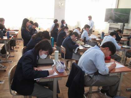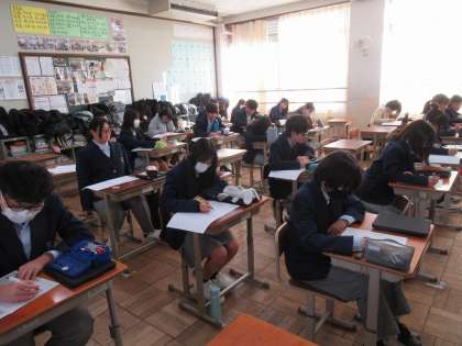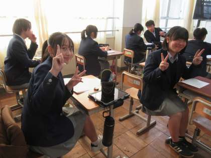項目ごとに振り返り、真剣に自己評価を記入していく姿が見られます。学年合唱でステージいっぱいに並んだ思い出に、笑いが起こる場面が見られます。背筋をピンと伸ばし、取材班の問いかけにハキハキ答えながら記入していくKさんがいます。ステキな学年です。