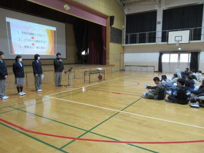 いきなりのお願いも快く引き受けてくれた6年Nさんのくす玉割りでスタートした今日の中学校体験。元気に挨拶してくれるし、大きな拍手を送ってくれるし、素晴らしい6年生の皆さんです。