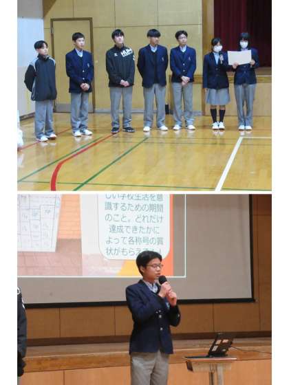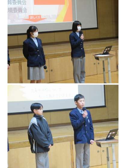 まずは、6年生の皆さんへ、生徒会本部役員の先輩より、中学校紹介です。