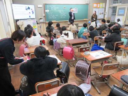 こちらは英語の授業風景です。積極的に発言している様子が見られます。一般動詞や助動詞の説明を受けて、キャラクターにふんして自己紹介を行う活動です。中学生も授業のサポートに入ってくれているので、6年生も安心です。