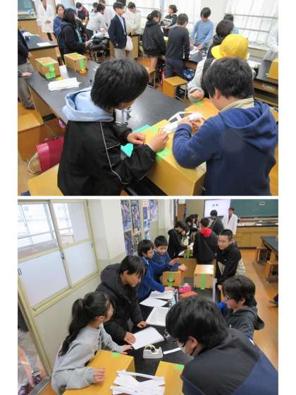 こちらは理科の授業風景です。「普通紙5枚で、レンガを支えるブリッジが作れるか!」という課題に、果敢に取り組む6年生の皆さんです。