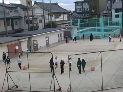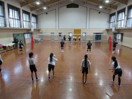 ソフトテニス部は、ラケットをもってレシーブの体験です。バレーボール部は、九条弘道小学校の体育館をお借りしての体験です。どちらも熱気を感じます。