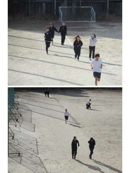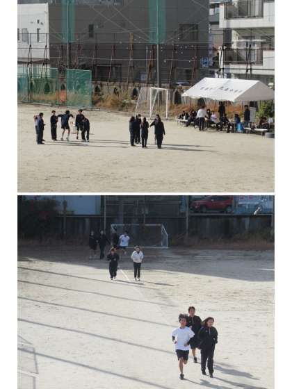 今日、1年2組の持久走の様子です。こちらは、ペアで、声かけ合って取り組んでいる場面が目立ちます。まるで対話しながら進んでいるようで、「高め合い」の要素を感じました。通じ合っていますね。