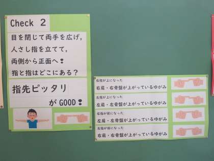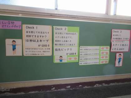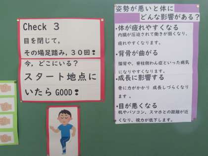 保健室の掲示板が更新されています。今月は、「正しい姿勢、できていますか?」をテーマに、日常的に気を付ける姿勢に関する内容を紹介していただいています。