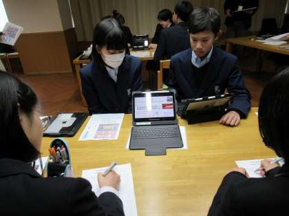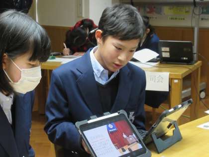 まず初めの学校紹介では、ペアに分かれ、回収運動やLevel Up Weekの取組、たてわり活動で行った学校行事についてやリーダー研修会・生徒会新聞の発行などについて、タブレットでスライドを示しながら説明してくれました。