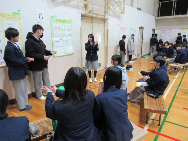 グループでの連携も上手です。役割を生かし、フォローしながら取組の成果を発表していきます。聞き手の皆さんも、しっかりした態度で素晴らしい!