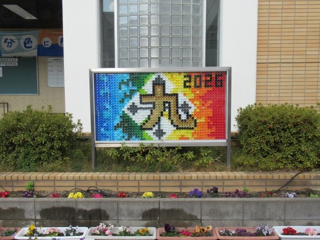 中庭の「エコキャップアート」がリニューアルされました。以前の卒業記念作品の思いを受け継ぎ、2026年版として生まれ変わりました。これまでの九条中生の輝きとともに、九条中学校を見守ってくれることでしょう。ステキ!