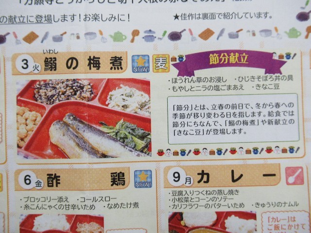 そこで本日の給食も、節分にちなんだ献立になっていて、「イワシの梅煮」や「きなこ豆」が登場しました。