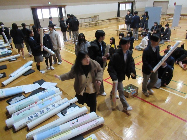 本日1限に、1年生は、ポスター発表に向けての準備を行いました。午後からの本番に向けて様子はどうかな?少し覗かせていただきました。