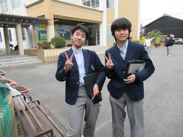 そこで今日は「園芸部」です。Nさん、Mさんが、上手に取材を進めてくれています。もちろん、こちらの取材にもVサインで応えてくれました。