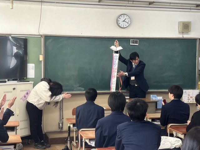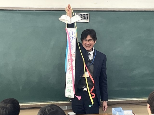 今回は、1組担任M先生にご協力いただき、全員のカウントダウンでくす玉を開きました。