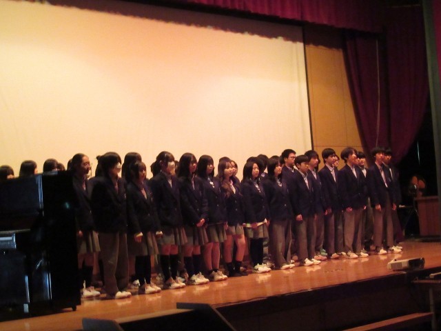 まずは1年生です。3年生への感謝の気持ちを込めた群読に続き、合唱へ。曲は「ありがとう」。指揮H・Rさん、ピアノ伴奏N・Mさんで、心のこもった歌声を送ってくれました。