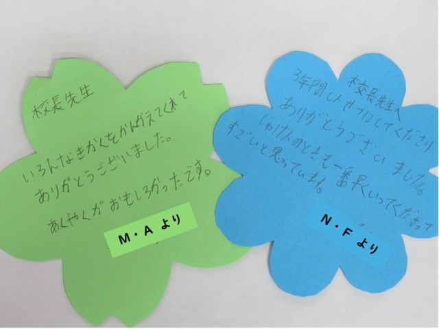 こちら4・5組では、お世話になった先生方へ、この日のために準備してくれた手作りのメッセージカードを渡していきました。