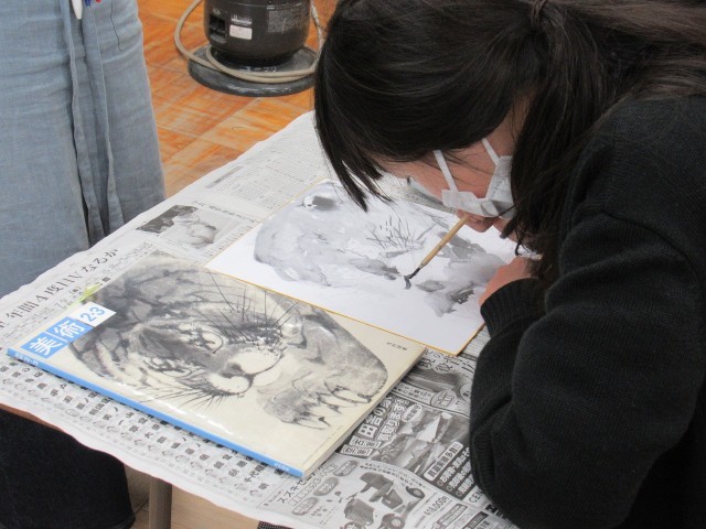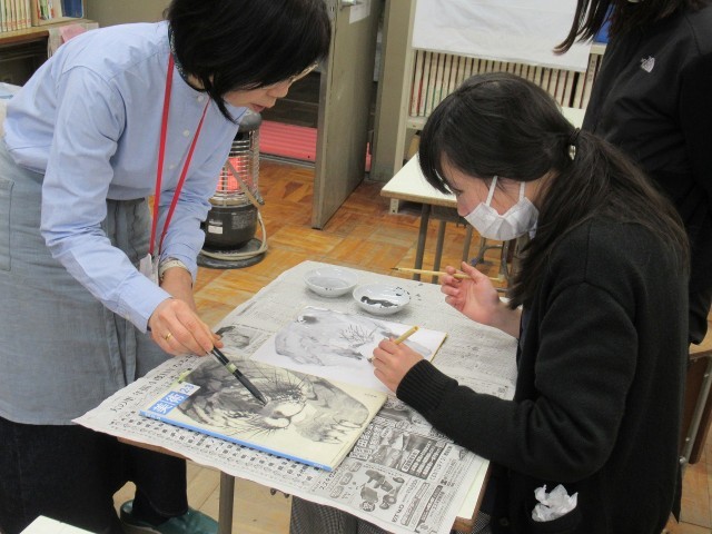 今日は「墨絵(すみえ)」の学習です。墨絵は、墨の黒と紙の白で描かれる白黒の美術作品です。勢いのある線やにじみを用いた描き方で、大胆で深みのある表現がうまく出せています。感心しました。