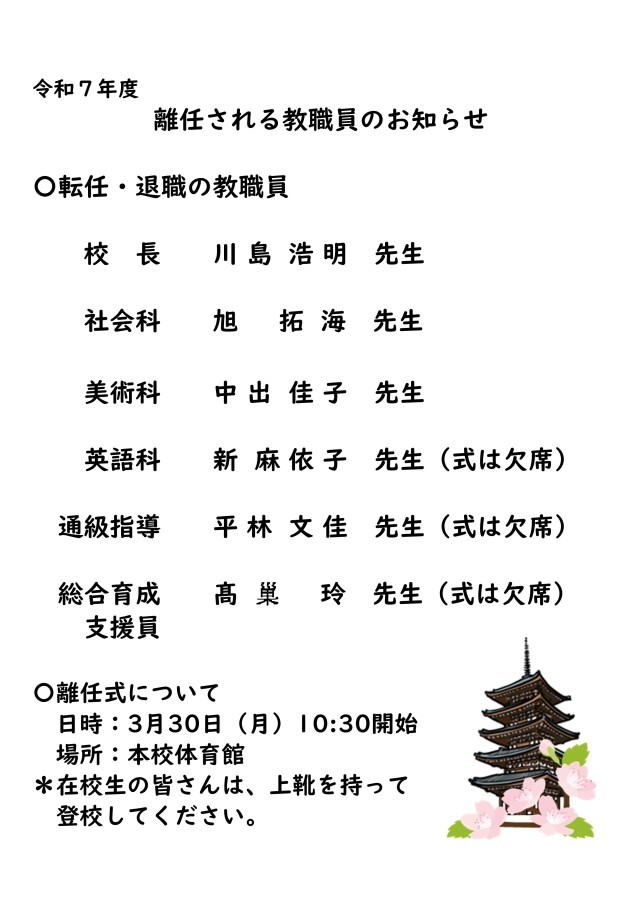 ※在校生の皆さんは、上靴を持って登校して下さい。