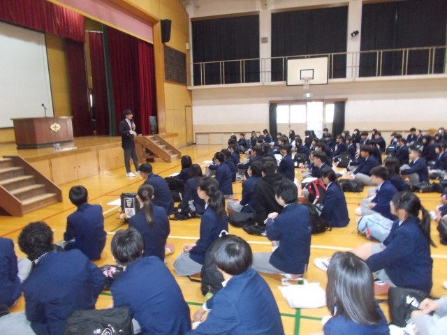 この後、体育館にて令和8年度の着任式・始業式が行われ、はじめに、今年度新たに九条中に着任された教職員が紹介され、代表生徒による歓迎の言葉がありました。