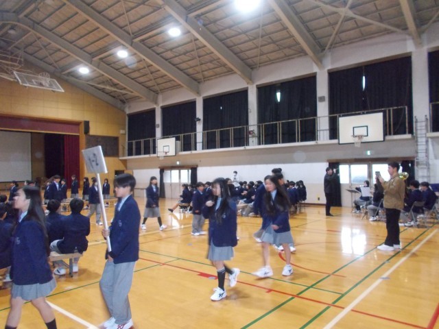 雨の一日となりましたが、3時間目には生徒会主催による「新入生を迎える会」が体育館で行われました。